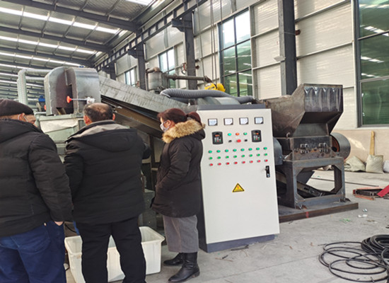 ? ? ?詳細了解了客戶需求后,推薦600型銅米機,600型銅米機一小時可處理爛雜線300多公斤,占地20平方,符合客戶對產量和場地的預算。接好線后開始試機,將廢雜線投入破碎機中,幾秒鐘就變成了銅和塑料的混合顆粒物,顆粒物通過上料輸送機進入氣流比重分選機,氣流比重分選機是利用銅和塑料重量不同的原理,在篩網不斷振動的作用下,將物料分開。只見銅和塑料分別流向各自的出口。客戶看到出的銅里夾雜著黃銅片銀色顆粒和黑色的小顆粒物就說分的不干凈。這問題可難不倒我們見多識廣的技術員。當時就把原因和解決方法告知客戶。原來,黑色的小顆粒是鐵,銀色的顆粒是鋁,黃銅片是插頭里的。問客戶是不是銅線鋁線沒分開,客戶說是。所以銅里會有銀色的顆粒物。解決辦法是:如果想分的干凈,首先線要干凈,起碼要分個8.9成,銅線和鋁線應該分開做,這樣純度就會高,賣價也會高。黃銅片有兩種解決辦法,一是專人將插頭剪去,統一來處理單獨賣黃銅紅銅片。二是出料口放置振動篩,將黃銅片和銅米篩分開來。至于物料里的鐵,量小的可以上磁鐵吸附。量大的可以上磁選機。這樣一一給客戶做了解釋,然后再給客戶現場操作,果不其然出的銅純度高了許多。