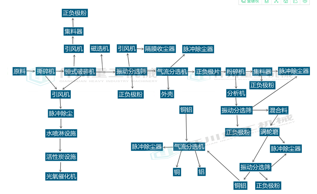 鋰電池回收處理工藝:氣流分選機(jī)2的工作面由重物料出口8的一端至輕物料出口7的一端向下傾斜設(shè)置。氣流分選機(jī)2內(nèi)部的工作面為篩網(wǎng),篩網(wǎng)的下部設(shè)置有鼓風(fēng)機(jī),篩網(wǎng)的運(yùn)動方式為往復(fù)振動,物料在工作面往復(fù)振動的作用下產(chǎn)生自動分級,比重大的物料沉于底部并與工作面接觸;比重小的物料浮于上層,在氣流的作用下呈懸浮或半懸浮狀態(tài),隨物料連續(xù)流入,上層物料在往復(fù)振動、自身重力、物料的推擠作用下,沿傾斜工作面向下部的出料口即輕物料出口7出來,而比重大的物料則沿傾斜工作面,在工作面的推力作用下向上部的出料口即重物料出口8爬行,從而實(shí)現(xiàn)物料分離,具體地,片的比重小于外殼和柱的比重,由此實(shí)現(xiàn)片由輕物料出口7收集,外殼和柱由重物料出口8收集。具體地,氣流分選機(jī)2的工作面的傾斜角度可調(diào),工作面的傾斜角度調(diào)節(jié)方式與現(xiàn)有技術(shù)中的調(diào)節(jié)方式相同,且鼓風(fēng)機(jī)的風(fēng)速可調(diào)。