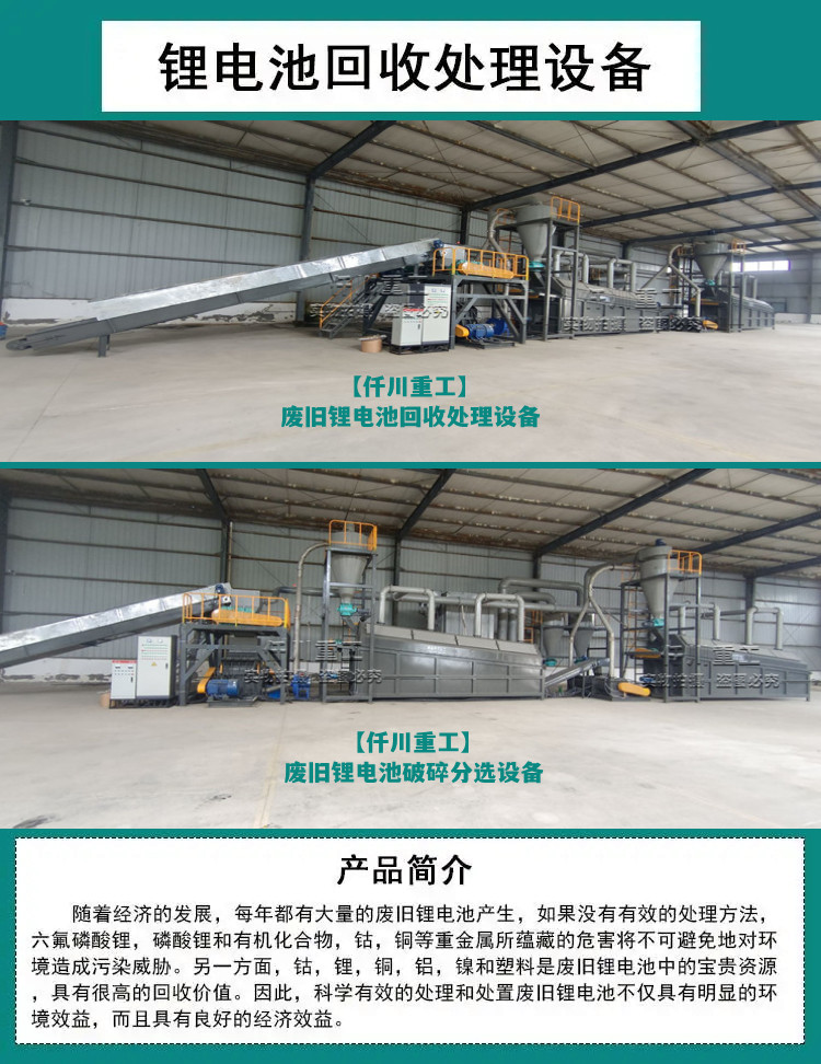 仟川重工鋰電池破碎回收設(shè)備目的是提供一種新型的廢舊鋰電池的回收處理方法,采用該方法能夠回收電池中的鈷,銅和鋰等貴重金屬元素,解決廢舊鋰電池的污染問題,實(shí)現(xiàn)資源的經(jīng)濟(jì)化回收利用。該鋰電池回收設(shè)備具有工藝簡單,經(jīng)濟(jì)實(shí)用的特點(diǎn)。